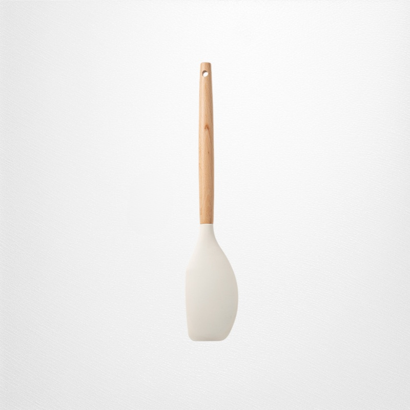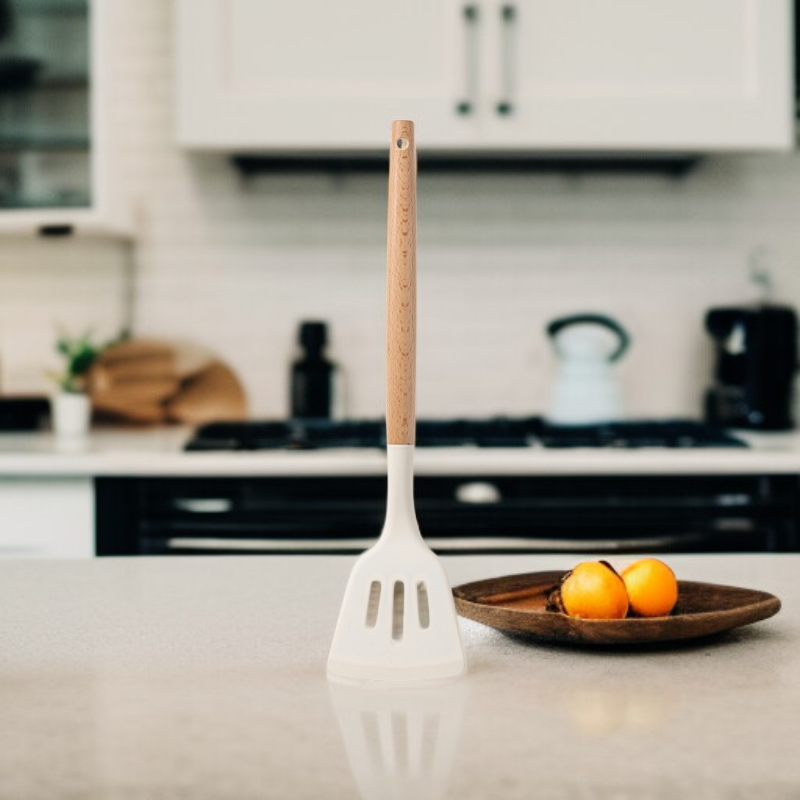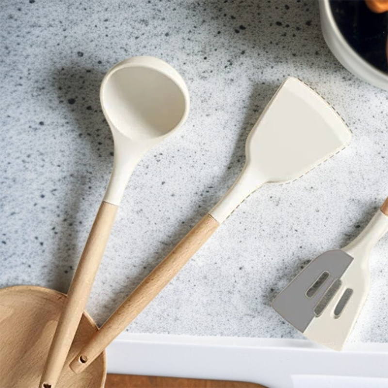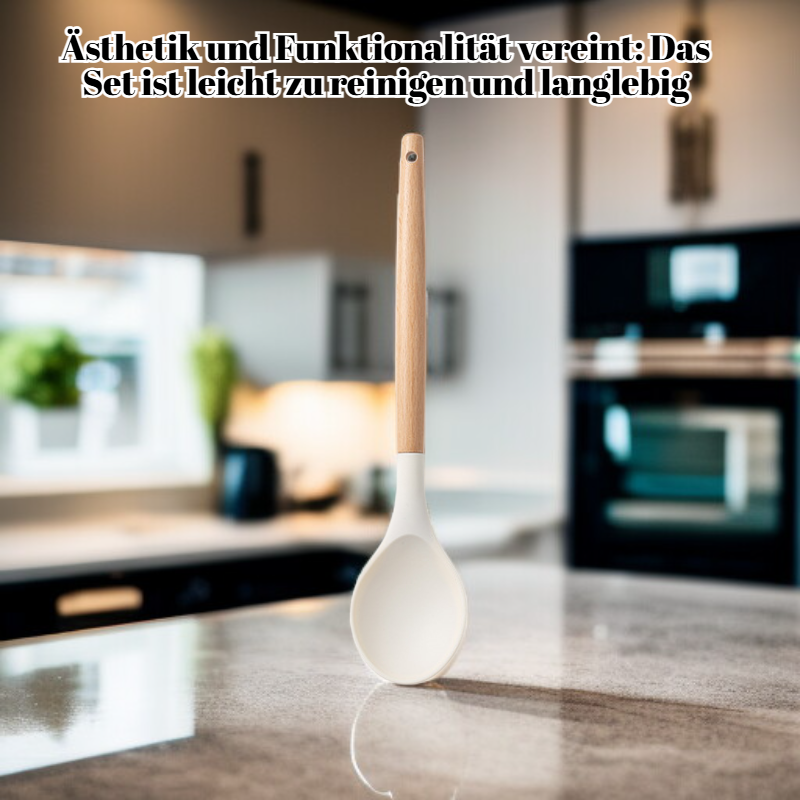 ● Hitzebeständiges Silikon schützt Töpfe und Pfannen vor Kratzern, während die ergonomischen Holzgriffe einen sicheren und komfortablen Halt bieten.