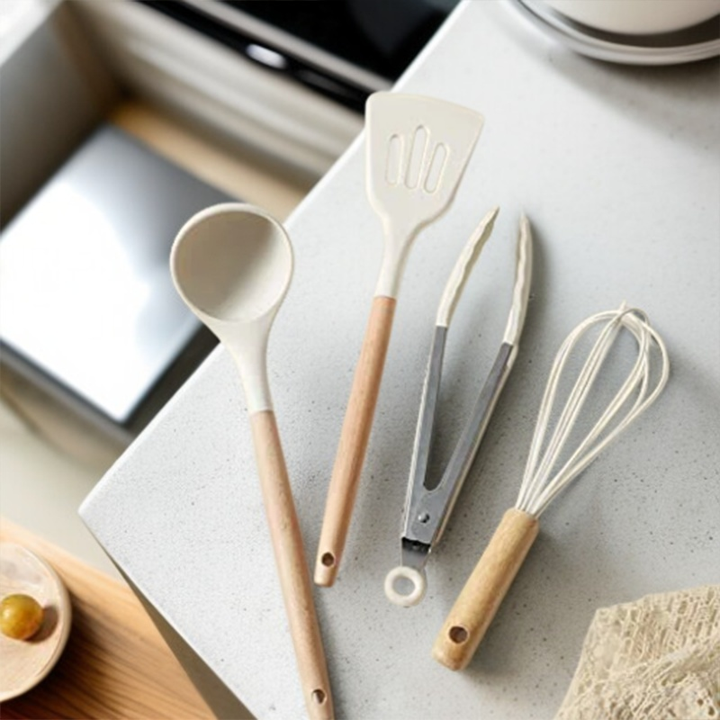 ● 12-teiliges Küchenhelfer-Set aus hochwertigem, weißem Silikon mit stilvollen Holzgriffen – modern und funktional für jede Küche im angesagten INS-Look.